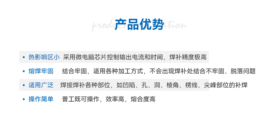 精密補(bǔ)焊機(jī)簡介:精密補(bǔ)焊機(jī)又稱仿激光焊、冷焊機(jī)、模具修補(bǔ)機(jī)。是專門針對模具和其他金屬五金產(chǎn)品表面加工尺寸過大、塌角、磨損、劃傷、針孔、裂紋、缺失變形、硬度降低、砂眼等缺陷進(jìn)行沉積、封孔、補(bǔ)平等修復(fù)功能。修復(fù)后基體不變形、不退火、不咬邊和沒殘余應(yīng)力,不改變其金屬金相組織內(nèi)部結(jié)構(gòu),修復(fù)的精度高,能達(dá)到激光焊的精度,又同時(shí)保證氬弧焊的速度,為企業(yè)創(chuàng)造最大的經(jīng)濟(jì)效益.